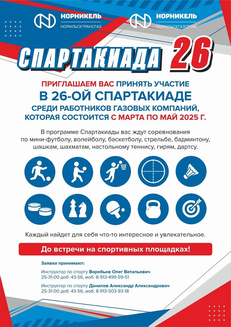24 марта – важный день для спортсменов-газовиков, ведь начилась 26-я Спартакиада среди сотрудников газовых компаний: АО «Норильсктрансгаз» и АО «Норильскгазпром». Соревнования традиционно охватывают широкий спектр спортивных дисциплин, позволяя каждому участнику найти занятие по душе и спортивным интересам. В индивидуальных видах программы участники смогут продемонстрировать своё мастерство в стрельбе, бадминтоне, шашках, шахматах, настольном теннисе, гиревом спорте и дартсе. Те, кто предпочитает командные игры, смогут проявить себя в захватывающих матчах по мини-футболу, волейболу и баскетболу.