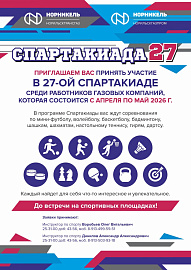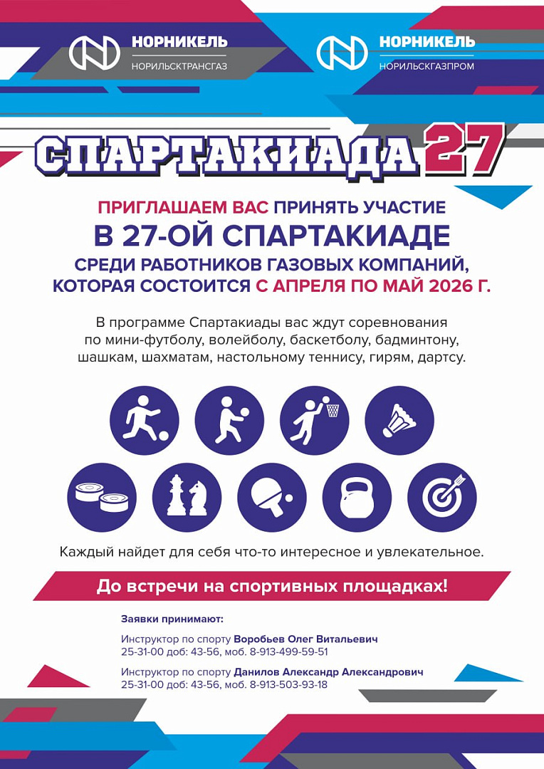 7 апреля стартует 27-я Спартакиада газовиков — масштабное спортивное событие для сотрудников АО «Норильсктрансгаз» и АО «Норильскгазпром». Соревнования, которые продлятся до конца мая, объединят любителей спорта в атмосфере здорового соперничества и командного духа.