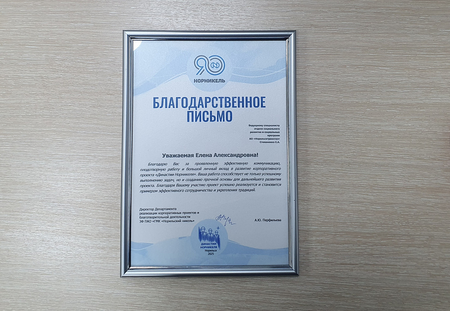Кроме того, за плодотворное сотрудничество, эффективную работу и большой личный вклад в развитие корпоративного проекта «Династии Норникеля» благодарственными письмами наградили специалистов и руководство предприятий.
